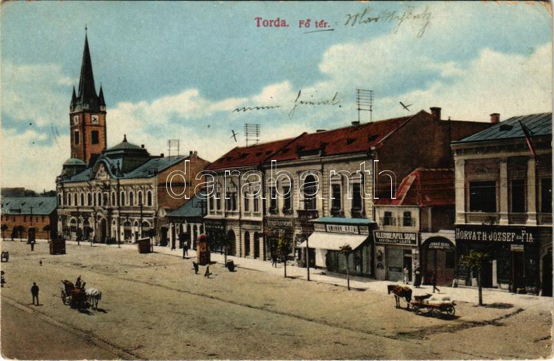 Torda, Turda; Fő tér, Horváth József és fia, Kleinhempel Samu és András Géza üzlete, Jónás Elek étterme, gyógyszertár. Füssy kiadása / street view, shops, restaurant, pharmacy (Rb)