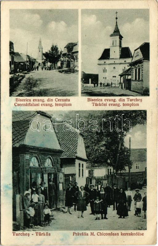 Türkös, Turches (Négyfalu, Sacele); Biserica evang. din Cernatu, Biserica evang. din Turches, Pravalia M. Chicomlean / Csernátfalusi evangélikus templom, türkösi evangélikus templom, M. Chicomlean üzlete / Lutheran churches, shop of Chicomlean (fl)