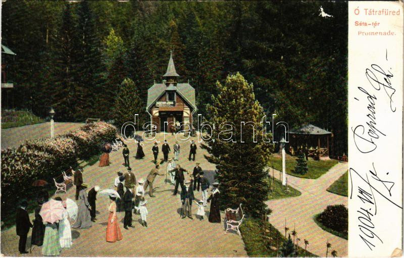 Leírás: 1904 Tátrafüred, Ótátrafüred, Altschmecks, Stary Smokovec (Tátra, Magas Tátra, Vysoké Tatry); Sétatér, Pásztory János üzlete. Feitzinger Ede No. 619. 1904/14. / Promenade / promenade, shop (EK)