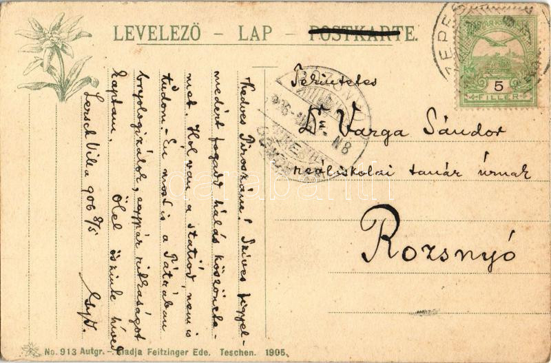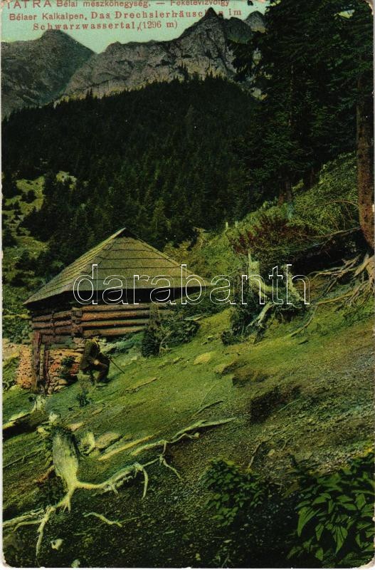 1906 Tátra, Magas-Tátra, Vysoké Tatry; Bélai mészkőhegység, Fekete víz völgy, Drechsler házikó a Drechsleren. Feitzinger Ede No. 913. Autgr. 1905. / Bélaer Kalkalpen, Das Drechslerhäuschen im Schwarzwassertal / Belianske Tatry, chalet, mountain rest house (EK)