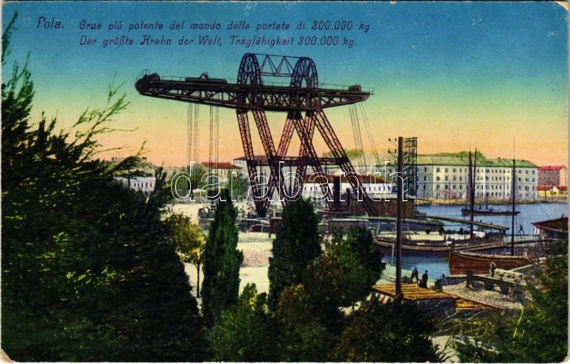 Pola, Pula; Der größte Krahn der Welt. Tragfähigkeit 300,000 kg / A világ legnagyobb daruja, teherbírása 300,000 kg, hajógyár. Photochrom C. Fano 1915/16. 2. / the largest crane in the world, shipyard