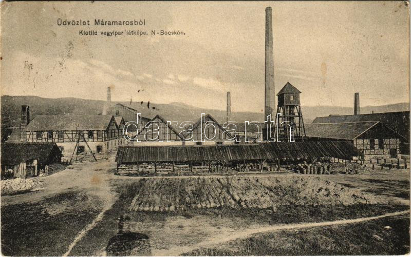 Leírás: Nagybocskó, Velikij Bicskiv, Velykyy Bychkiv (Máramaros); Klotild vegyipar látképe, gyár. Kaifman Á. és fiai kiadása / chemical factory (EK)