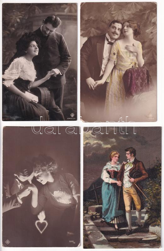 Leírás: 12 db RÉGI romantikus képeslap vegyes minőségben: szerelmes párok / 12 pre-1945 romantic postcards in mixed quality: couples in love