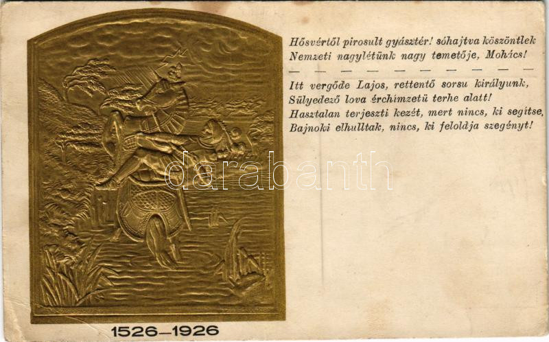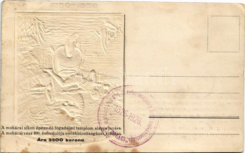 1526-1926 Mohácsi vész 400. évfordulójának dombornyomott emléklapja. A mohácsi síkon építendő Fogadalmi templom alapja javára. Kiss Gy. domborműve. Szeiler vésnök / 400th anniversary of the Battle of Mohács, charity card Emb. + So. Stpl. (EB)