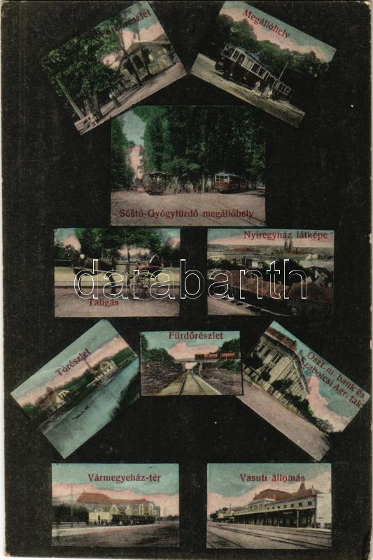 Leírás: 1912 Nyíregyháza, Sóstógyógyfürdő; vasútállomás, megállóhelyek, taligás, Osztrák-magyar bank és Szabolcsi Agrár takarékpénztár, Vármegyeház tér (EK)
