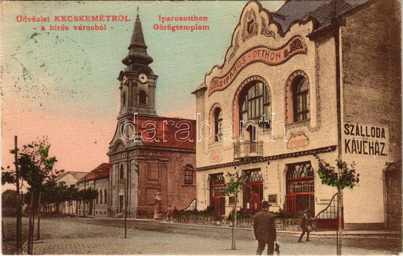 1913 Kecskemét, Iparosotthon és görög templom, szálloda és kávéház. Fe... https://www.darabanth.com/hu/435-Gyorsarveres/435.0/Kepeslapok/Magyarorszag~2500004/1913-Kecskemet-Iparosotthon-es-gorog-templom-szalloda-es-kavehaz-Fekete-Schwartz-Soma-~II2816011