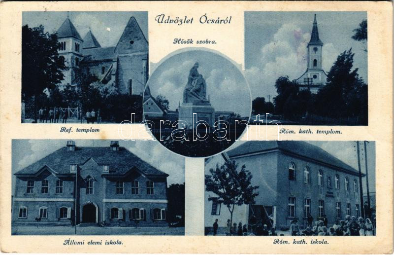 Leírás: 1932 Ócsa, Hősök szobra, emlékmű, Református templom, Római katolikus templom, Állami elemi iskola, Római katolikus iskola (fl)