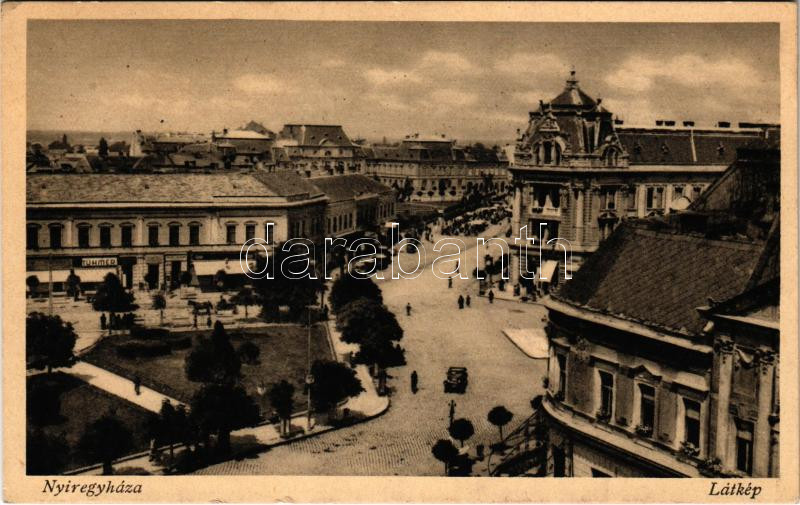 Leírás: 1934 Nyíregyháza, látkép, üzletek, piac, automobil (EK)
