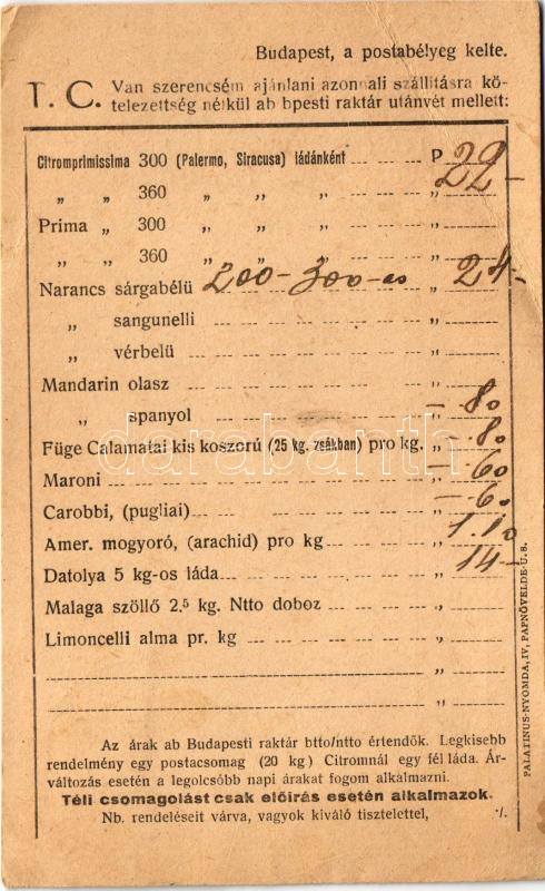 1929 Zwirn Sámuel marroni, déligyümölcs, gyümölcs és korai főzelék behozatala és kivitele. Budapest IX. Pipa utca 6. / Hungarian fruit importer's shop advertisement (EB)