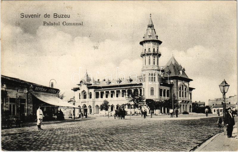 Leírás: 1909 Buzau, Buzeu, Bodzavásár; Palatul Comunal, Bereria Azuga / town hall, beer hall (EK)