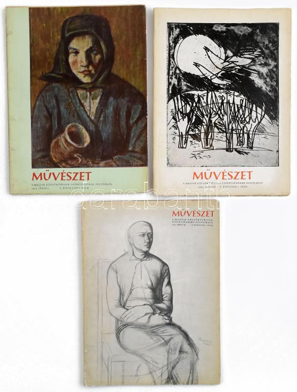 1964 Művészet, a Magyar Képzőművészek Szövetségének folyóirata, V. évf. 1., 2., 6. sz. (3 db). Fekete-fehér képekkel gazdagon illusztrálva. Vegyes állapotban.