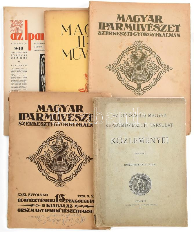 5 db művészeti folyóirat: 1896 Az Országos Magyar Képzőművészeti Társulat közleményei 1896. évre + 1928 Magyar Iparművészet XXXI. évf. 5-6. és 9. sz. + 1936 Magyar Iparművészet XXIX. évf. 1. sz. + 1939 Az Iparművész X. évf. 9-10. sz. Vegyes állapotban.
