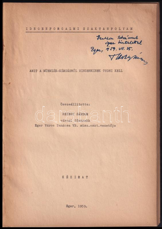 Az összeállító, Hevesy Sándor (1902-1985) építészmérnök által Genthon István (1903-1969) művészettörténész részére DEDIKÁLT példány. Kézirat. Bp., 1959., Hevesmegyei Tanács Idegenforgami Hivatala, 80 p. Kiadói papírkötés, foltos.