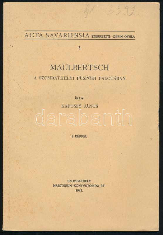 Leírás: Kapossy János: Maulbertsch a szombathelyi püspöki palotában. Acta Savariensia 5. Szombathely, 1943., Martineum, 23 p.+8 t. Kiadói papírkötés