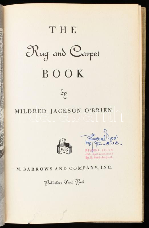 Mildred Jackson O'Brien: The rug and carpet book. New York,1946.,M. Barrows and Company Inc., 166 p.+10 (fekete-fehér fotók) t. Angol nyelven. Kiadói egészvászon-kötés, festett felsÅ‘ lapélekkel, javÃtott cÃmlappal, jó állapotban. Pfannl Egon (1911-1973) épÃtész, grafikus névbélyegzÅ‘jével és saját kezű névbejegyzésével. SzÅ‘nyegbecsüs szakkönyv.