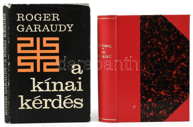 2 db Kínával kapcsolatos könyv: Yutang [Jü-tang], Lin: Mi kínaiak. Ford.: Benedek Marcell. Bp., 1943, Révai, 371 p. Átkötött, modern kötésben. + Garaudy, Roger: A kínai kérdés. Ford.: Várkonyi Tibor és Józsa Péter. Bp., 1968, Kossuth. Kiadói műbőr-kötés, kissé sérült kiadói papír védőborítóban.