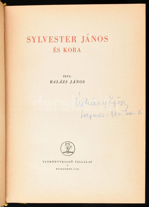 Balázs János: Sylvester János és kora. Bp., 1958., Tankönyvkiadó. Kiadói félvászon-kötés, kopott, kissé foltos borítóval. Megjelent 1500 példányban.