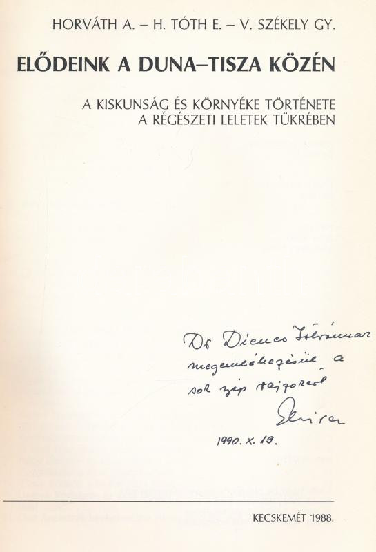 Horváth Attila - H. Tóth Elvira - V. Székely György: Elődeink a Duna-Tisza közén. A Kiskunság és környéke története a régészeti leletek tükrében. Szerk.: H. Tóth Elvira. Az egyik szerző, szerkesztő, H. Tóth Elvira (1929-2015) régész, muzeológus által Dienes István (1929-1995) régész, muzeológus részére DEDIKÁLT példány. Kecskemét, 1988., Katona József Múzeum. Gazdag fekete-fehér képanyaggal illusztrált. Kiállítási vezető. Kiadói papírkötés. Megjelent 2000 példányban.