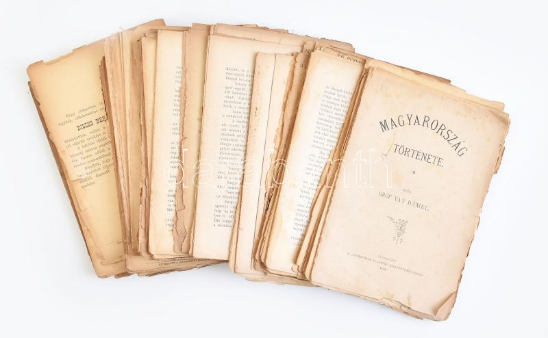 Leírás: Vay Dániel, gróf: Magyarország története. 1-41. füzetek. Debrecen, 1888, "Debreczeni Ellenőr" könyvnyomdája. Felvágatlan, helyenként kissé foltos lapokkal, sérült állapotban, szakadt, szétvált borítókkal. (Teljes átnézésre nem került, hiányok előfordulhatnak.)