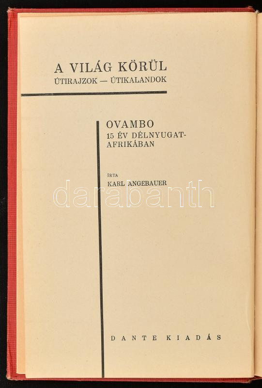 Karl Angebauer: Ovambo - 15 év Délnyugat-Afrikában. A világ körül - Útirajzok - útkalandok. Fordíotta Szirmay Józsefné. Budapest, (1931), Dante Könyvkiadó. Kiadói egészvászon kötés, fekete-fehér fotókkal és egy térképpel illusztrálva.