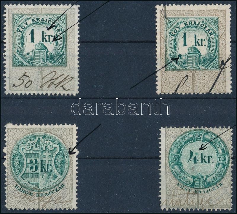 1868 1,3,4 kr 4 db, foltokkal, kitörésekkel / with dots, break-outs https://www.darabanth.com/hu/435-Gyorsarveres/435.0/Magyar-filatelia-es-postatortenet/Okmanybelyegek~500018/1868-1-3-4-kr-4-db-foltokkal-kitoresekkel-with-dots-break-outs~II1864227