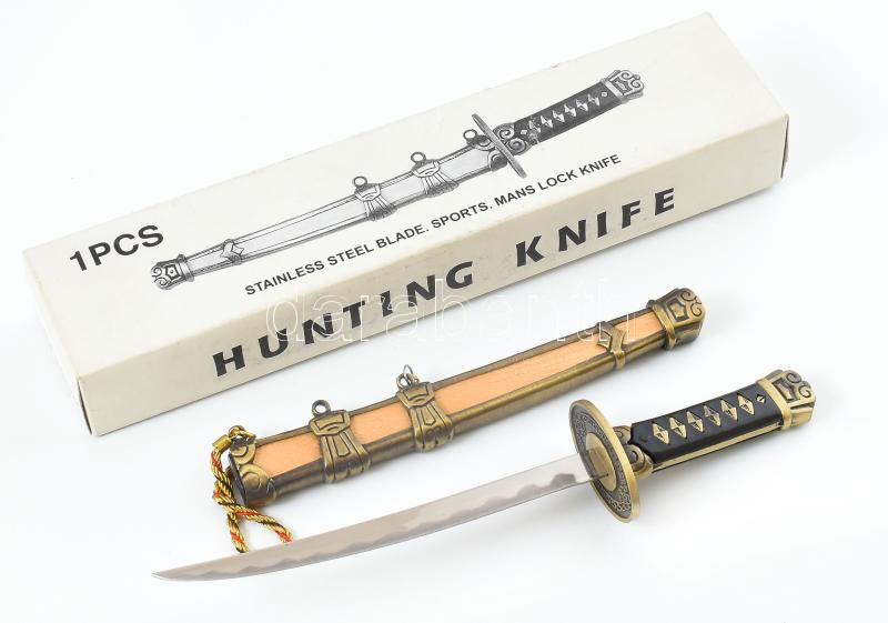 Leírás: Katana formájú mini dísz kard, kés. Jelzett acél pengével, fém és fa hüvellyel. Eredeti dobozában, h: 24 cm