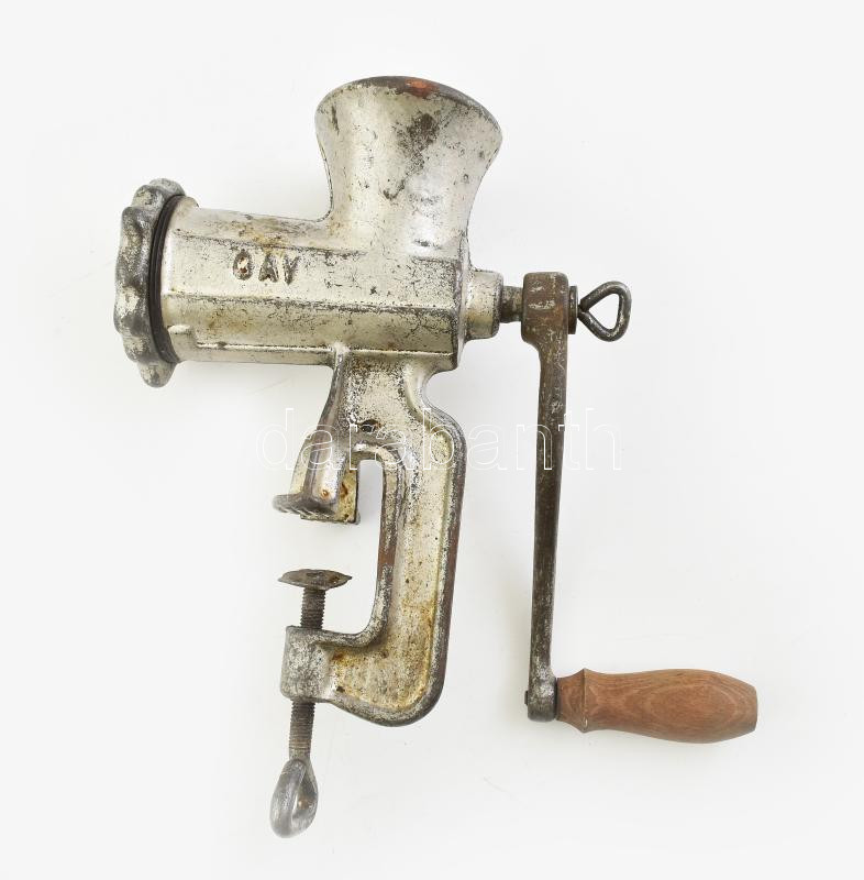 Leírás: Masszív öntöttvas húsdaráló, jelzett: GAV SZ 8, kopott, 30x27x10 cm