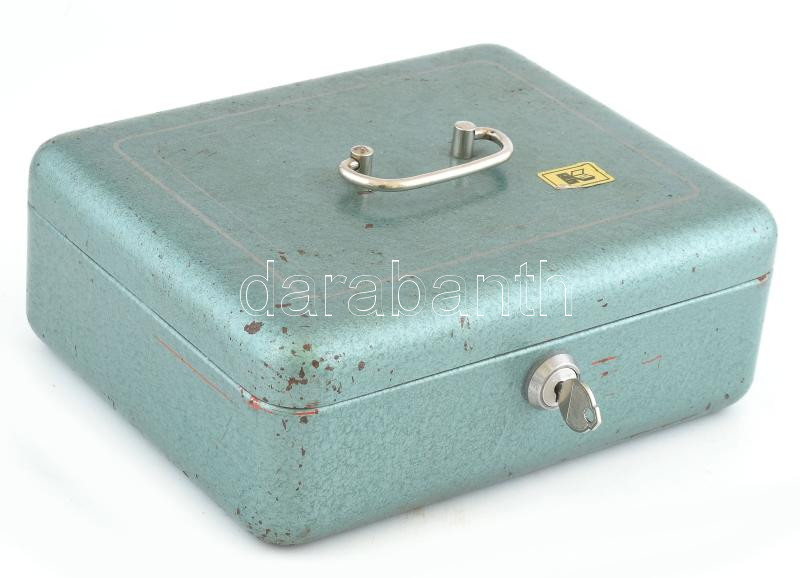 Leírás: Retró pénztári kazetta, zománcozott fém, kulccsal, kopott, 25x20x9 cm