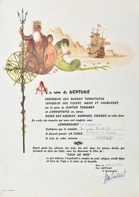 Leírás: 1972 Neptune hajós emlékoklevél, illusztrált, francia nyelvű, feltekerve, kissé foltos, 39x30 cm