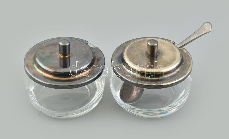 Leírás: 2 db dzsem / lekvár kínáló, üveg, ezüstözött fém tetővel, 1 db ezüstözött jelzett: WMF kanállal. hibátlan, d: 9,5 cm
