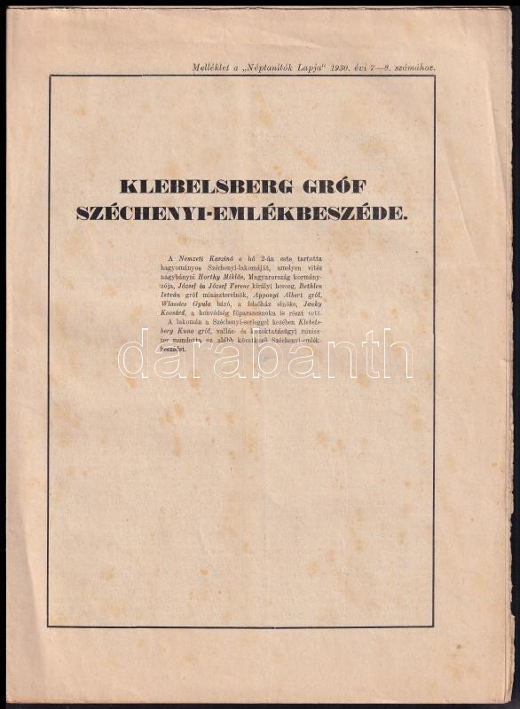 1930 Klebelsberg Kuno 2 írása: A jövő dala, Klebesberg Kuna Gróf Széch... https://www.darabanth.com/hu/435-Gyorsarveres/435.0/Mutargy-papirregiseg-egyeb/Nyomtatvanyok~2000003/1930-Klebelsberg-Kuno-2-irasa-A-jovo-dala-Klebesberg-Kuna-Grof-Szechenyi-emlekbeszede-4-7~II2823103