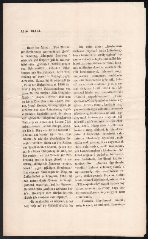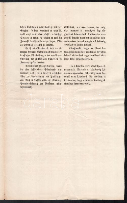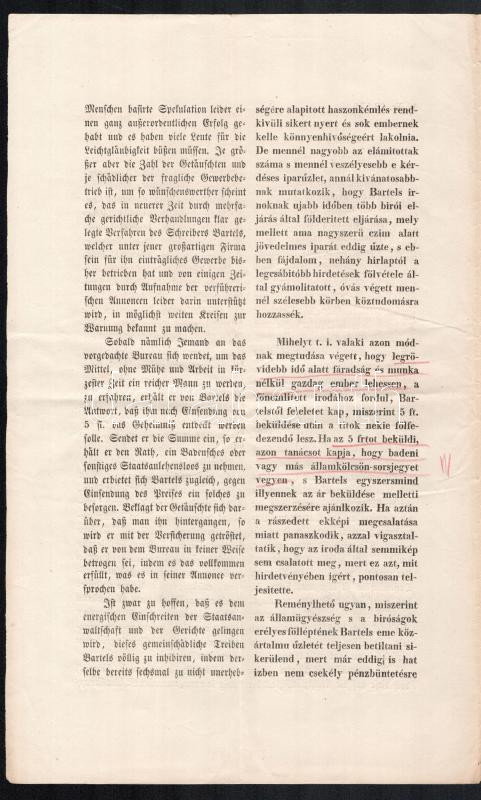 Leírás: cca 1850 Újságban hirdetett piramisjáték leírása hatósági nyomtatványon német és magyar nyelven 3 p