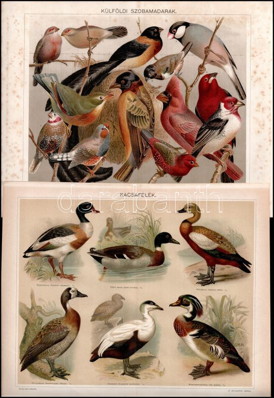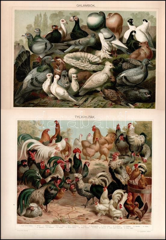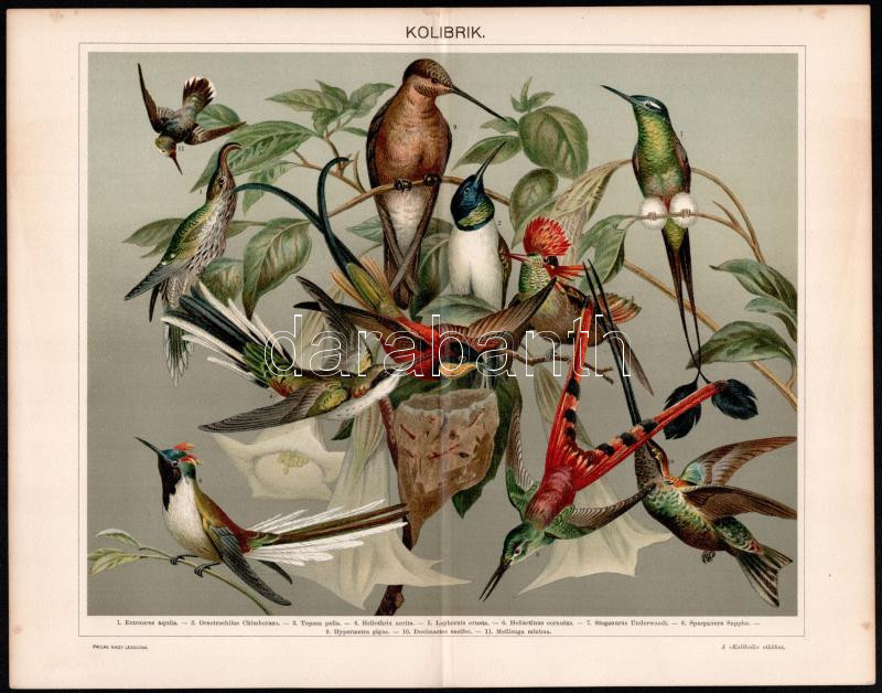 Leírás: cca 1895-1900 6 db színes madár illusztráció (ragadozó madarak, galambok, kolibrik stb.) a Pallas Nagy Lexikonából, részben foltos, 24x30 cm
