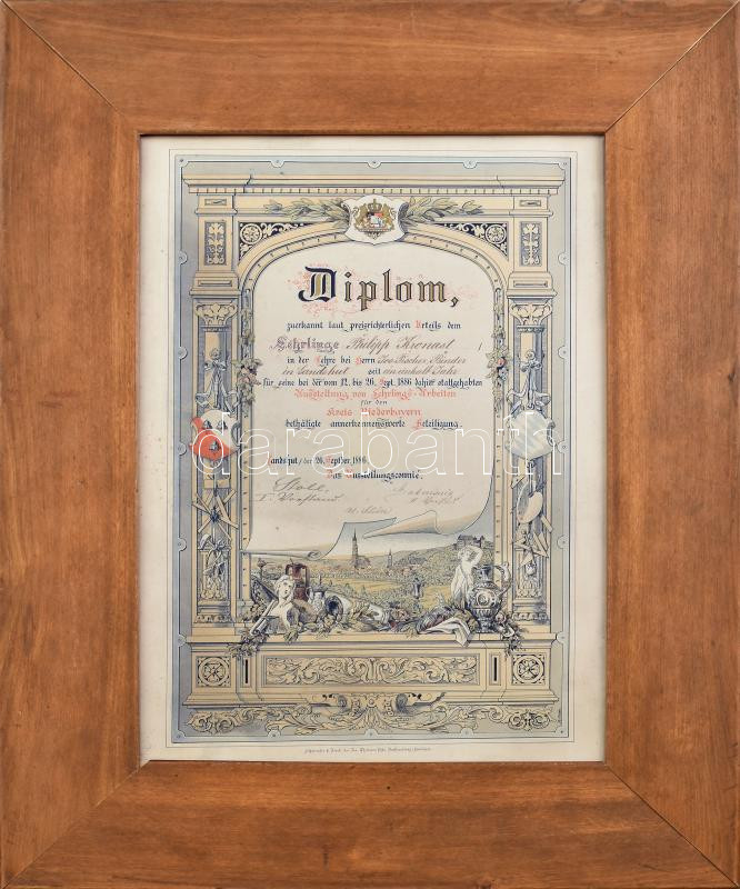 Leírás: 1886 Mesterlevél könyvkötő részére, dekoratív ornamentikával és címerrel díszített, Landshut Bajorország. Litográfia, papír. 43×27 cm. Üvegezett fakeretben. / Niederbayern, Landshut, Lehrlingsdiplom, Binder, Litografie.