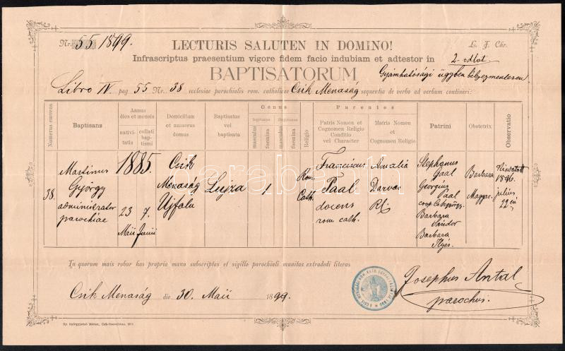 1899 Csíkmenaság (Armăseni), Erdély, latin nyelvű keresztlevél, hajtot... https://www.darabanth.com/hu/435-Gyorsarveres/435.0/Mutargy-papirregiseg-egyeb/Okmanyok~500019/1899-Csikmenasag-ArmC483seni-Erdely-latin-nyelvu-keresztlevel-hajtott-jo-allapotban~II2820190