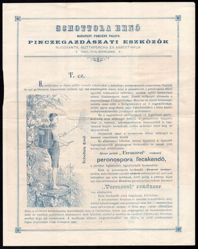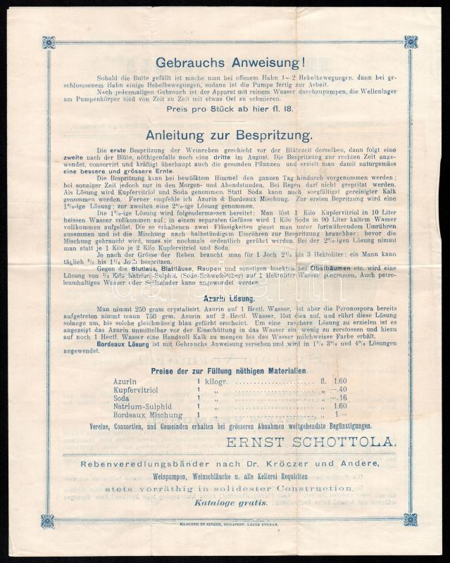 Leírás: cca 1890 Schottola Ernő pincegazdasági eszközök 4 oldalas reklám nyomtatvány