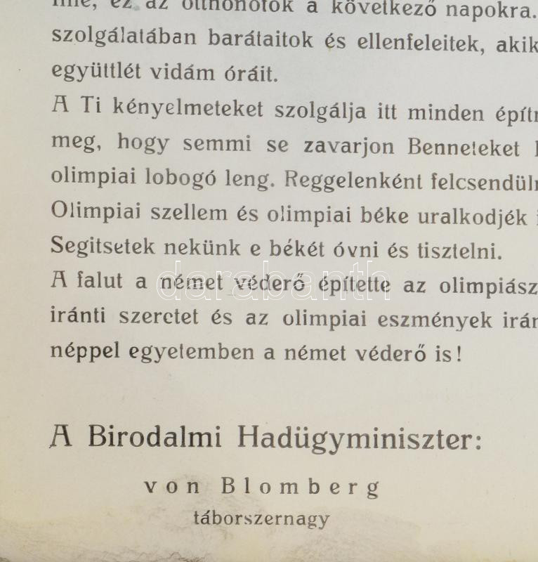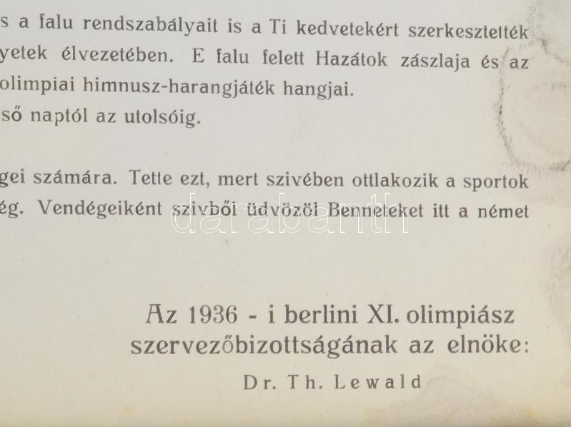 1936 Berlini Olimpia. Az olimpiai falu magyar sportolói részére adott üdvözlő nyomtatvány magyar nyelven. Kissé foltos, korabeli üvegezett keretben. Ritkaság! / Berlin Ollympic Games greeting for the Hungarian sportsmen in Hungarian. With some stains in vintage glazed frame. 24x34 cm