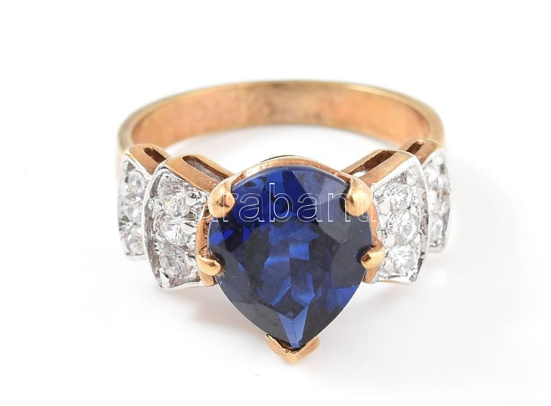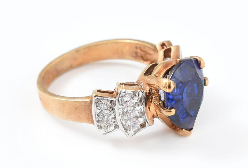 Leírás: Aranyozott ezüst (Ag) gyűrű kék és fehér kövekkel. Jelzett, bruttó: 4,6 g, m: 54