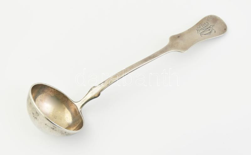 Leírás: Ezüst(Ag) monogramos tejmerő kanál, jelzett, h: 21,5 cm, nettó: 76 g