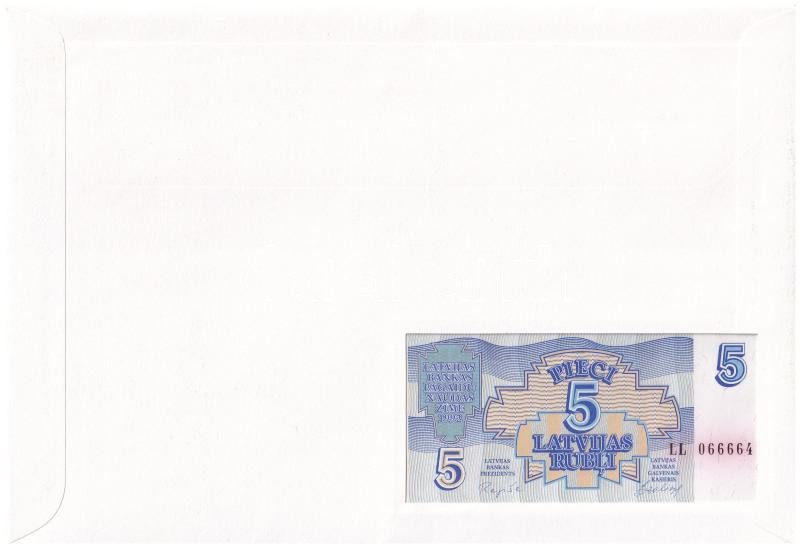 Latvia... https://www.darabanth.com/hu/435-Gyorsarveres/435.0/Numizmatika/Ermes-es-bankjegyes-boritekok~1000004/Lettorszag-1992-5R-felbelyegzett-boritekban-belyegzessel-TI-Latvia-1992-5-Rublis-in-envel~II2794788
