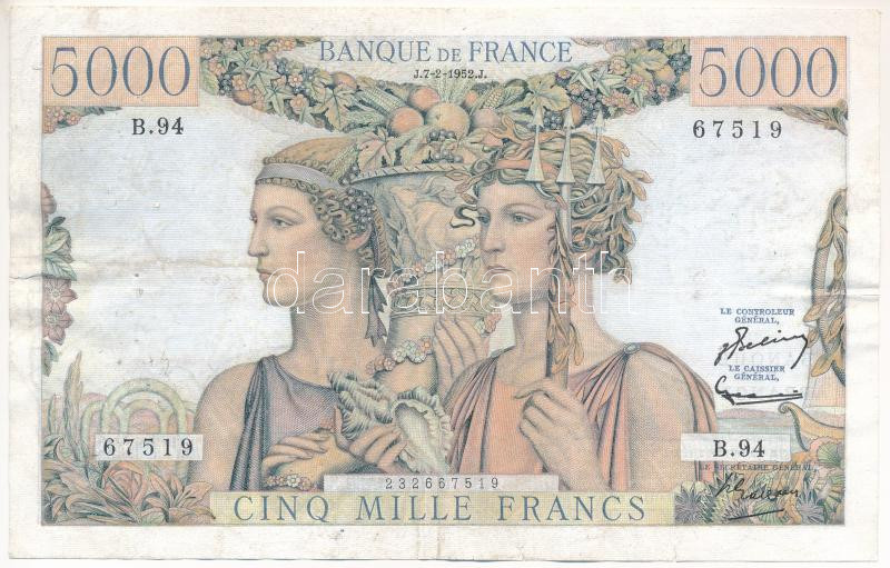 Fra... https://www.darabanth.com/hu/435-Gyorsarveres/435.0/Numizmatika/Kulfoldi-bankjegyek~1500030/Franciaorszag-1952-5000Fr-B94-67519-TIII-tulyukak--France-1952-5000-Francs-B94-67519-CF~II2820186