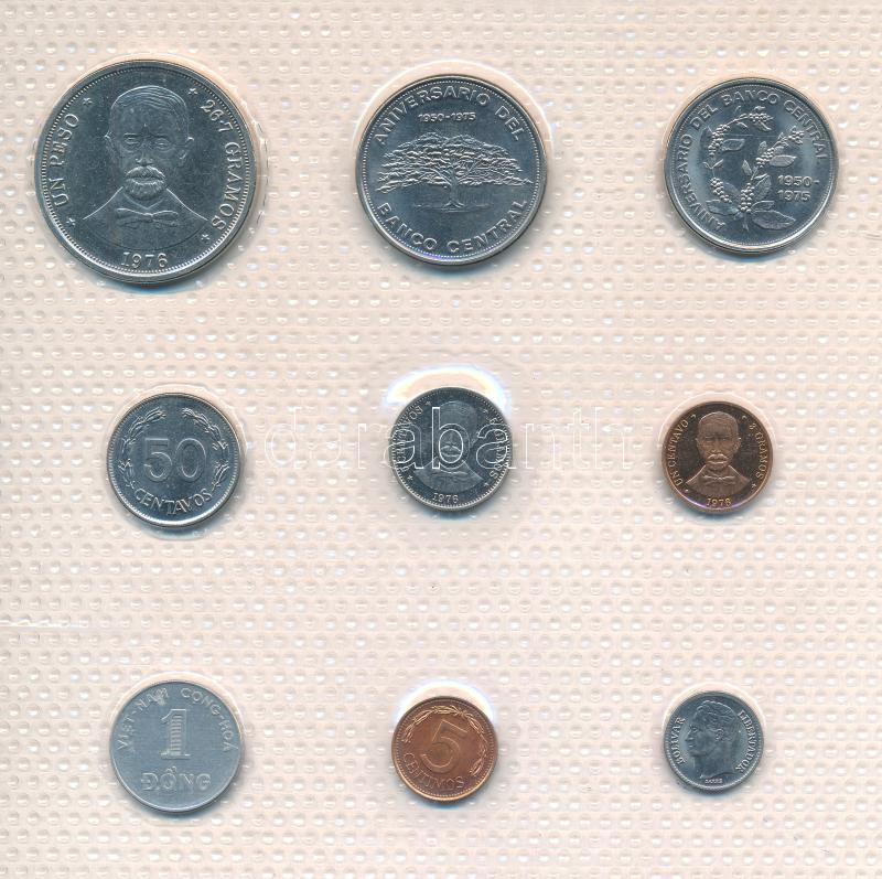 9 darabos külföldi érme összeállítás laminált fóliában, közte Dominikai köztársaság, Costa Rica, Ecuador, Venezuela, Vietnam T:1-,2 9 pieces foreign coin lot in laminated film, within Dominican Republic, Costa Rica, Ecuador, Venezuela, Vietnam C:AU,XF