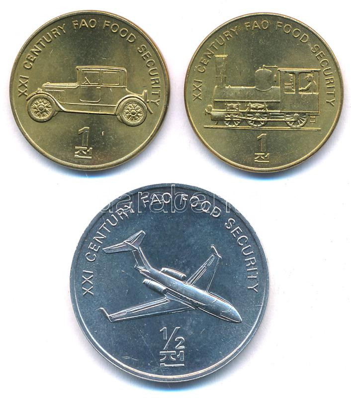 North Korea 2002. 1/2 Chon Al "FAO / Jet airliner" + 1 Chon brass "FAO / Automobile" + 1 Chon brass + "FAO / Steam Train" C:UNC