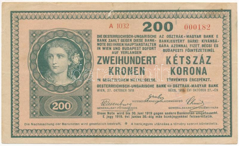 Leírás: 1918. 200K "A 1032 000182" sima hátlappal T:III szakadás, folt, firka Adamo K31/2