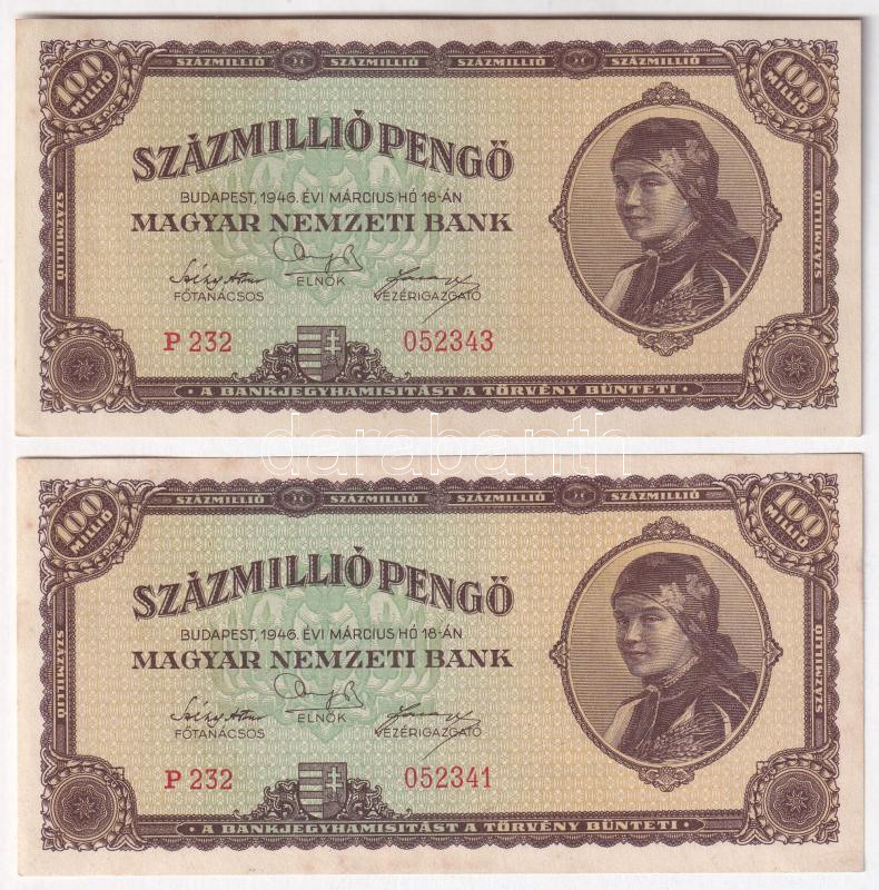 1946. 100.000.000P (2x) egyugrású sorszámkövető "P 22 052341, P 2... https://www.darabanth.com/hu/435-Gyorsarveres/435.0/Numizmatika/Magyar-bankjegyek~1000007/1946-100000000P-2x-egyugrasu-sorszamkoveto-P-22-052341-P-232-052343-TII-szep-papir-~II2816620