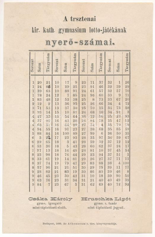 Leírás: Budapest 1880. "A trsztenai kir. kath. gymnasium" lottó játékának nyerőszámait felsoroló lap T:III hátoldalán írással