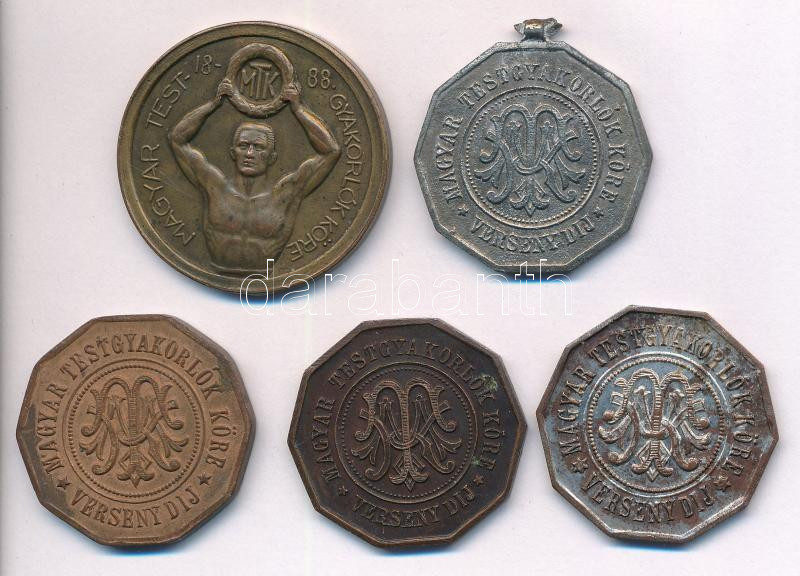 Leírás: Szitányi Gábor, Szege Sándor ~1930. "Magyar Testgyakorlók Köre - 1888" kétoldalas bronz díjérem (33mm) + "MTK verseny díj" nyolszögletű, kétoldalas bronz díjérem (2x) + "MTK verseny díj" nyolcszögletű kétoldalas, ezüstözött bronz díjérem (2x) T:1- - 2 közte patina, hajlott