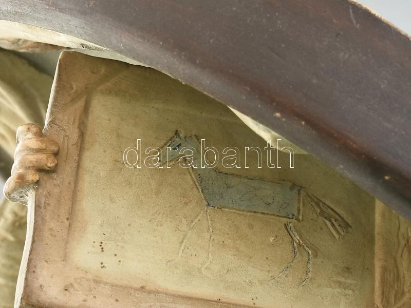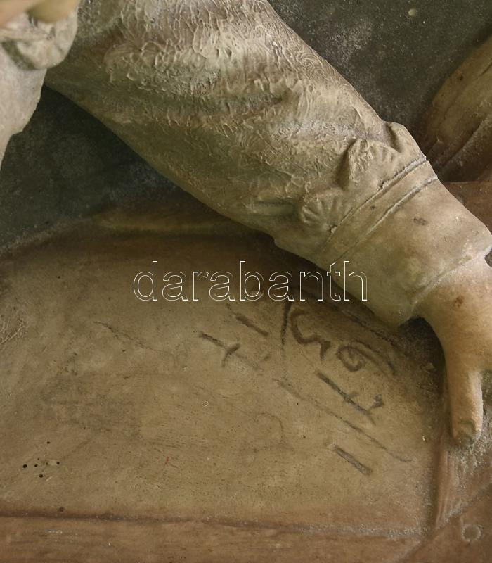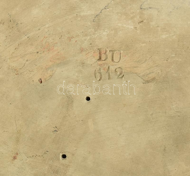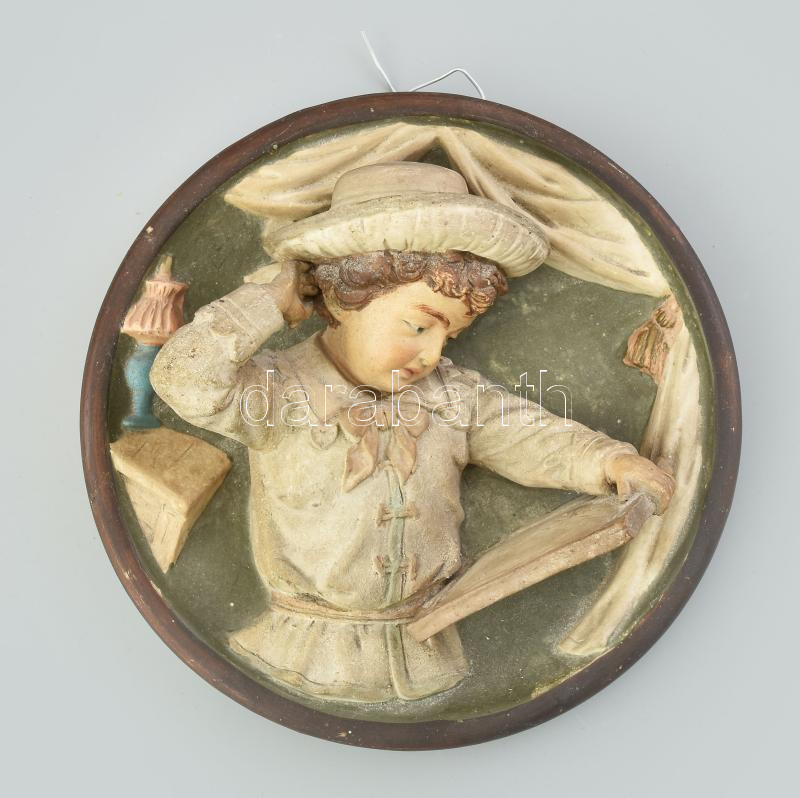 Kalapos kisfiú táblával. Mázas kerámia fali plasztika, hátoldalán BU 612 jelzéssel/formaszámmal. XIX. sz. vége/XX. sz. eleje. Hátsó peremén kisebb sérüléssel, lepattanásokkal, d: 20 cm