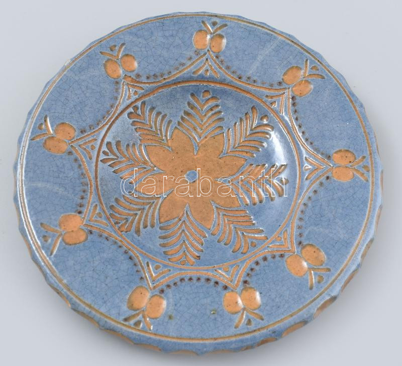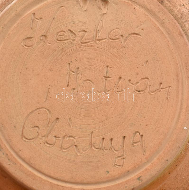 Leírás: Keszler István, Óbánya: Népi kerámia falitányér. Kézzel festett, jelzett, apró lepattanással, mázrepedésekkel, d: 17 cm