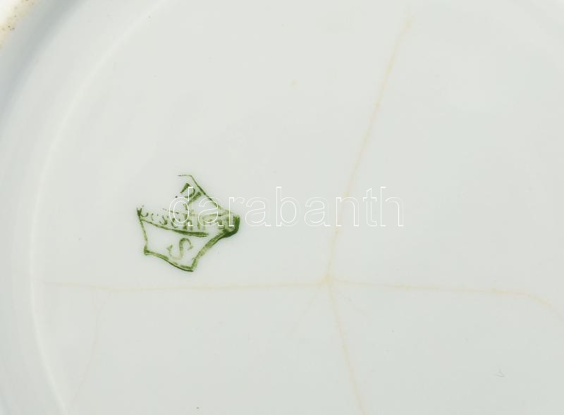 Leírás: Antik porcelán emlékbögre, irizáló, plasztikus virágos mintával, kopásokkal, m: 8,5 cm + Pfeiffer & Löwenstein tányér/alj, kézzel festett, jelzett, kopott, d: 16 cm